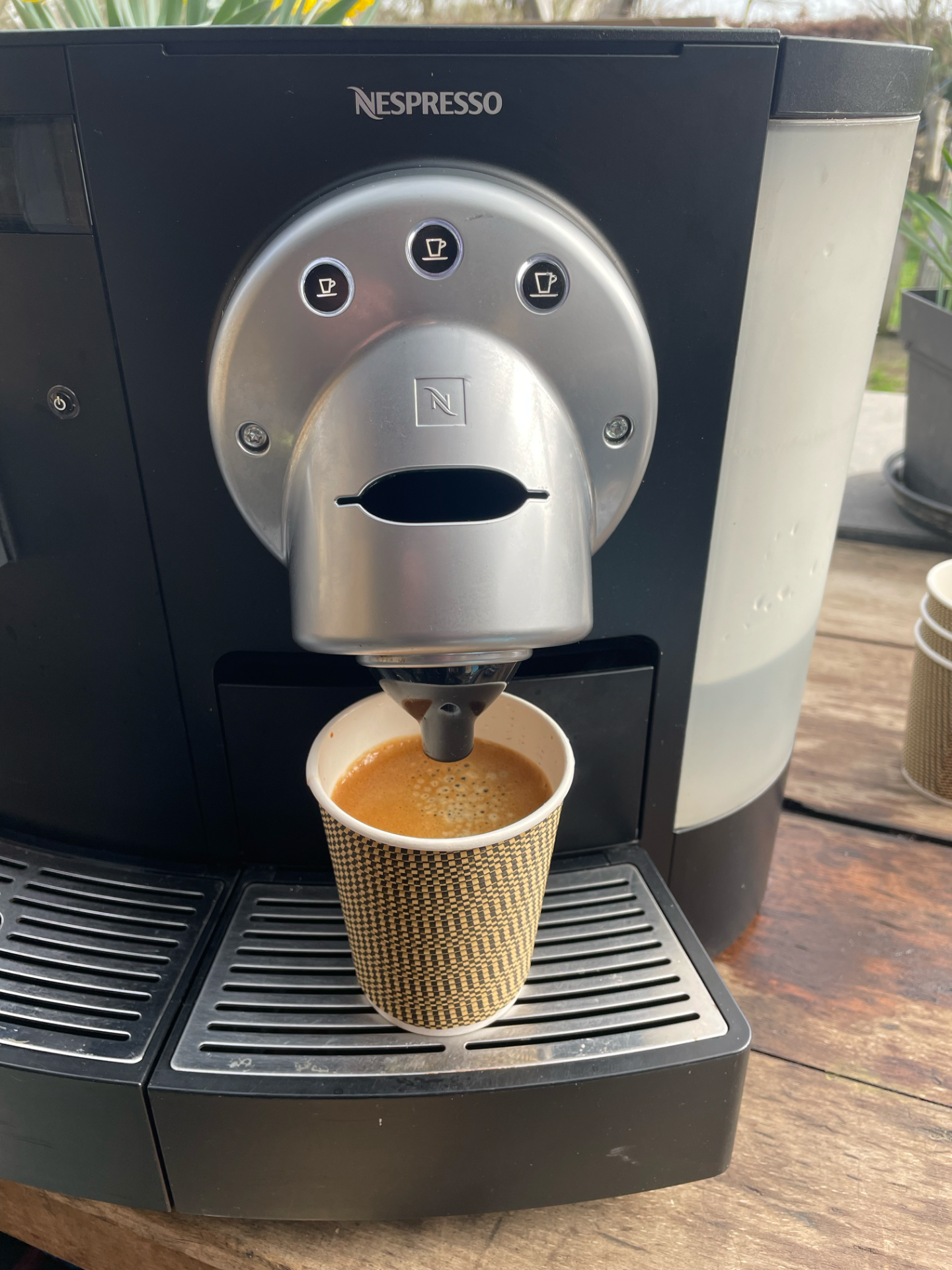 Nespresso machine, mogelijkheid om 2 koffies tegelijk te zetten, warm wateruitloop, 2 reservoirs van 3l of rechtstreeks op waterleiding. Enkel te gebruiken met professionele pads. Mogelijkheid om deze mee te bestellen aan 0,5 per koffie.